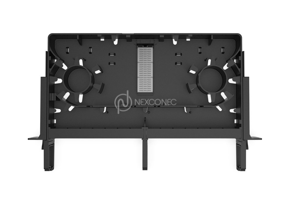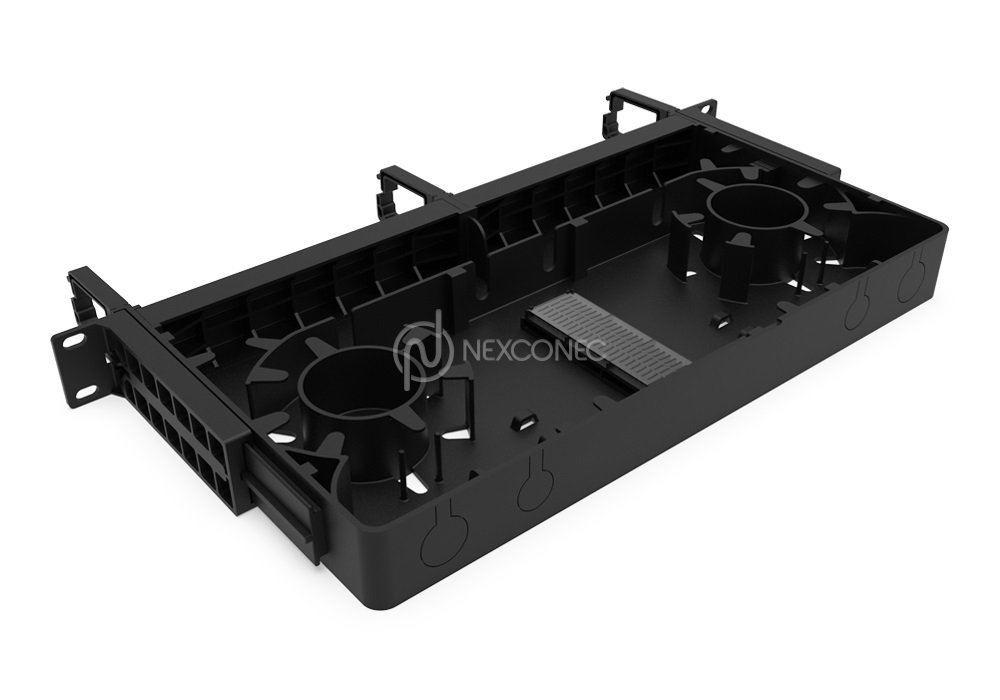 El innovador panel de empalme deslizante de 1RU NEXCONEC® está diseñado para alojar hasta 96 fibras ópticas, distribuidas en cuatro soportes de empalme con capacidad para 24 fibras cada uno. Incorpora bobinas moldeadas que garantizan el mantenimiento del radio de curvatura óptimo, protegiendo tanto los cables de entrada como de salida y permitiendo el almacenamiento ordenado de fibras para futuras conexiones.