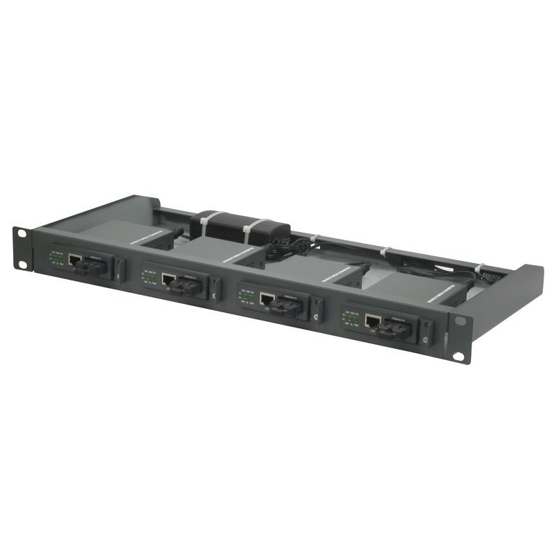 Chasis 19″ KCR-4MC. Es un chasis simple de montaje en rack de 19 ”para los dispositivos de conversión de medios de KTI. Proporciona cuatro ranuras para la instalación de cuatro convertidores de medios independientes.