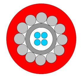 Cable de galgas extensométricas de fibra óptica distribuida con amortiguador hermético metálico y cubierta exterior estructurada de PA para medir deformaciones de hasta el 1 %