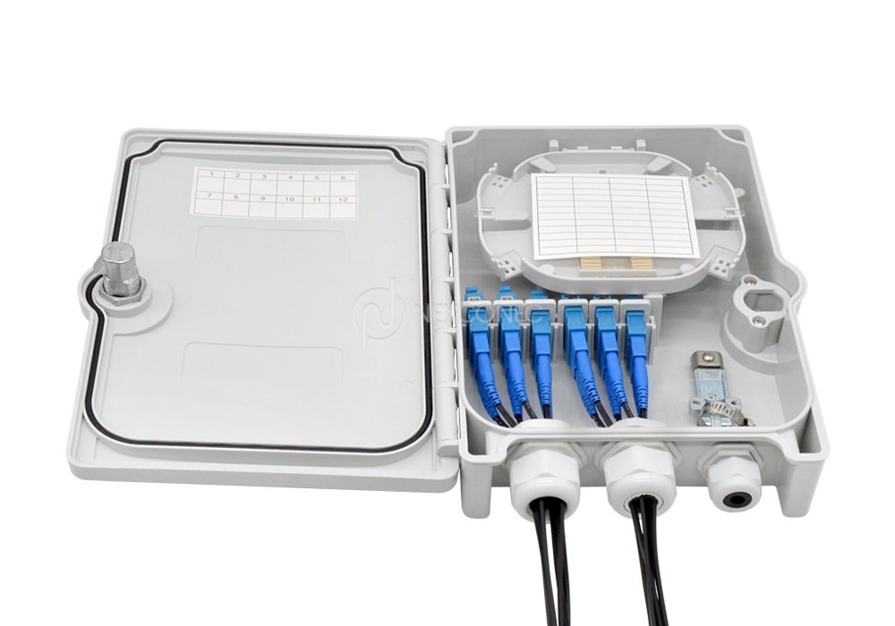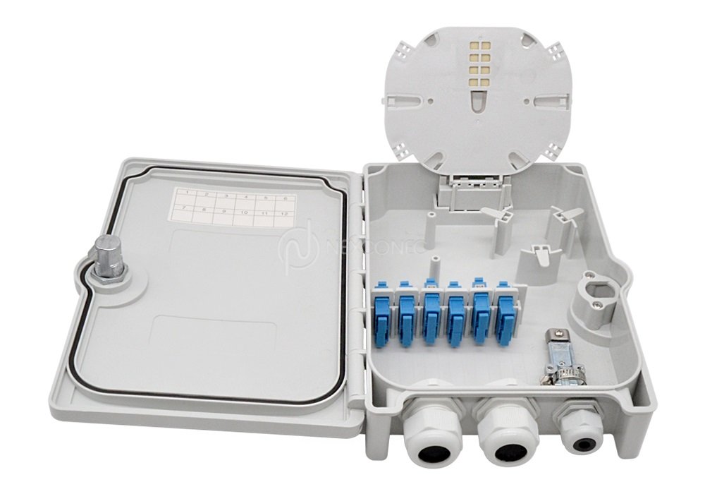 La caja de fibra óptica también cuenta con una bandeja de empalme desmontable para una fácil instalación, así como con 6 lugares para adaptadores intercambiables.